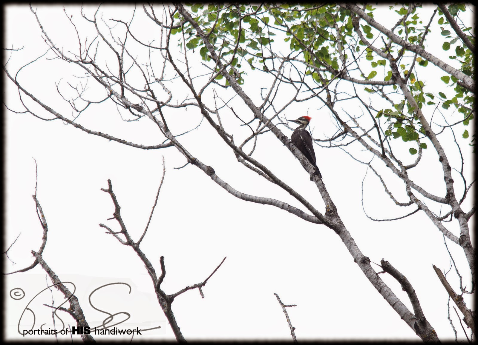 Finally on our last day before leaving, I heard the Pileated Woodpeckers another time and thought I'd make one more try at getting a closer picture. We were mostly packed up and ready to go, but I had to give it one more try. My persistence paid off and with some great care and strategy in my approach, I got close enough for a few pictures before it skittered around the tree with its big claws and noisily flew away. Success! Such a beautiful bird though.